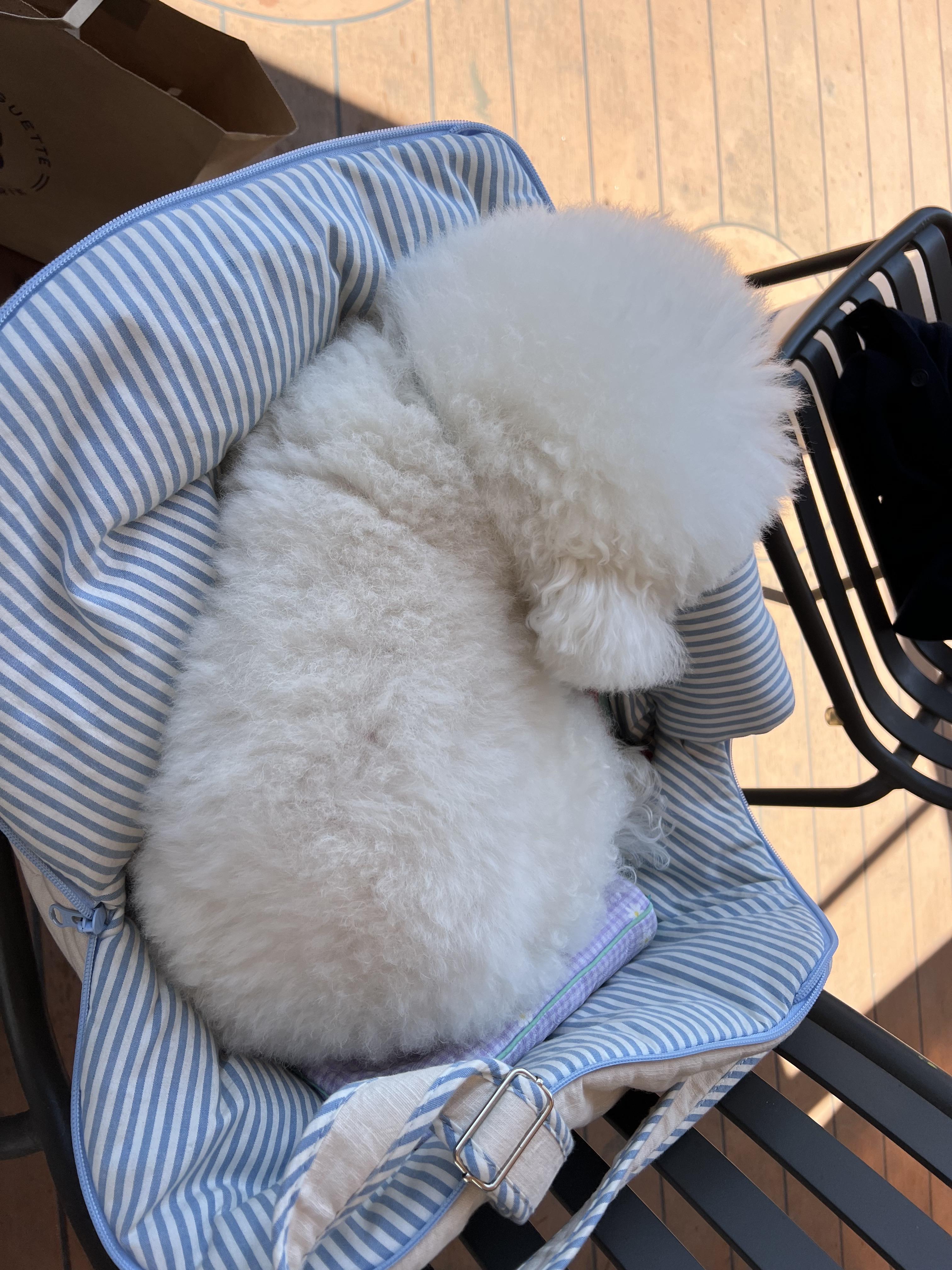 10월, 4월에 퀸제누비아호를 이용했을 때 객실 내부가 생각보다 더웠다. 특히 더위를 많이 타는 솜이는 헥헥 거리며 더워하느라 캐빈 안에서 계속 뒤척거렸다. 그래서 이동가방에 쿨매트와 아이스팩 파우치를 꺼내주고, 유모차에 사용하던 휴대용 선풍기를 틀어 체온을 낮춰 주었다. 그리고 챙겨간 물그릇에 틈틈이 물을 주어 수분 섭취를 도왔다.