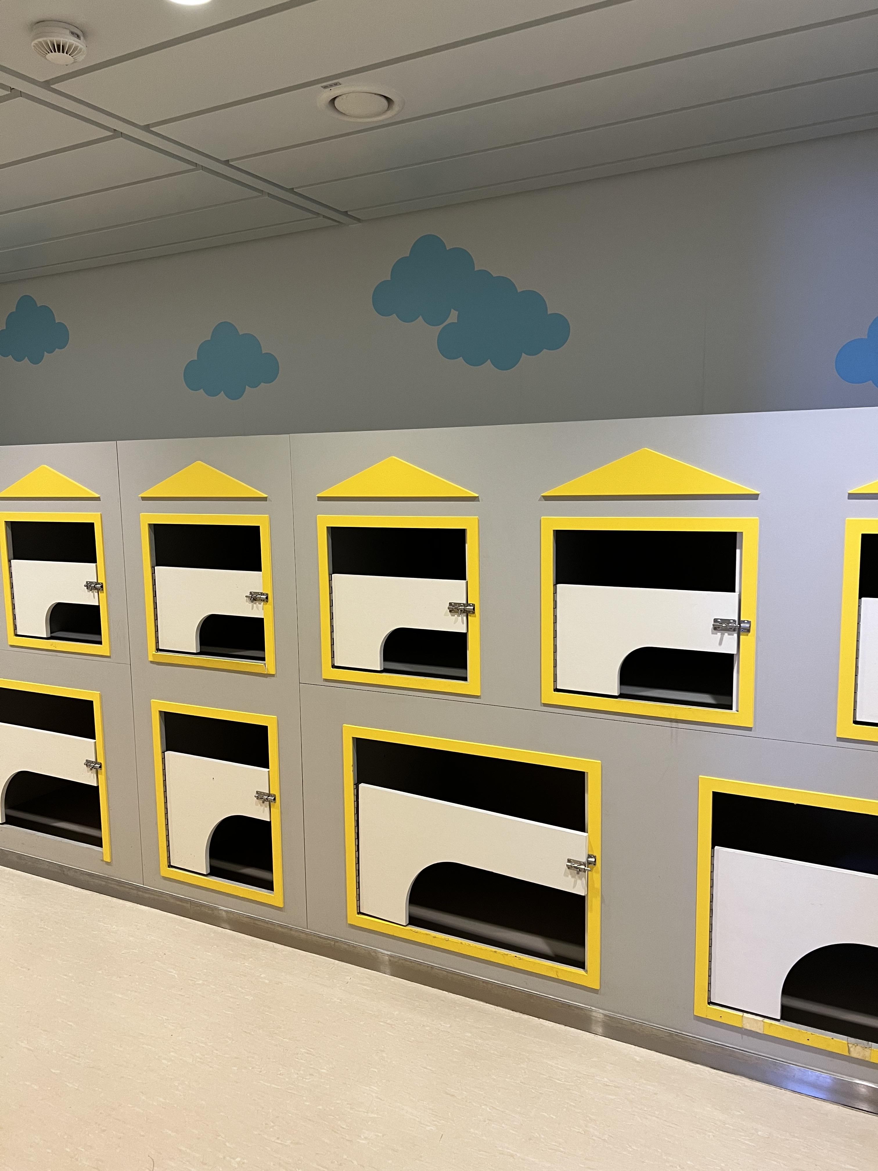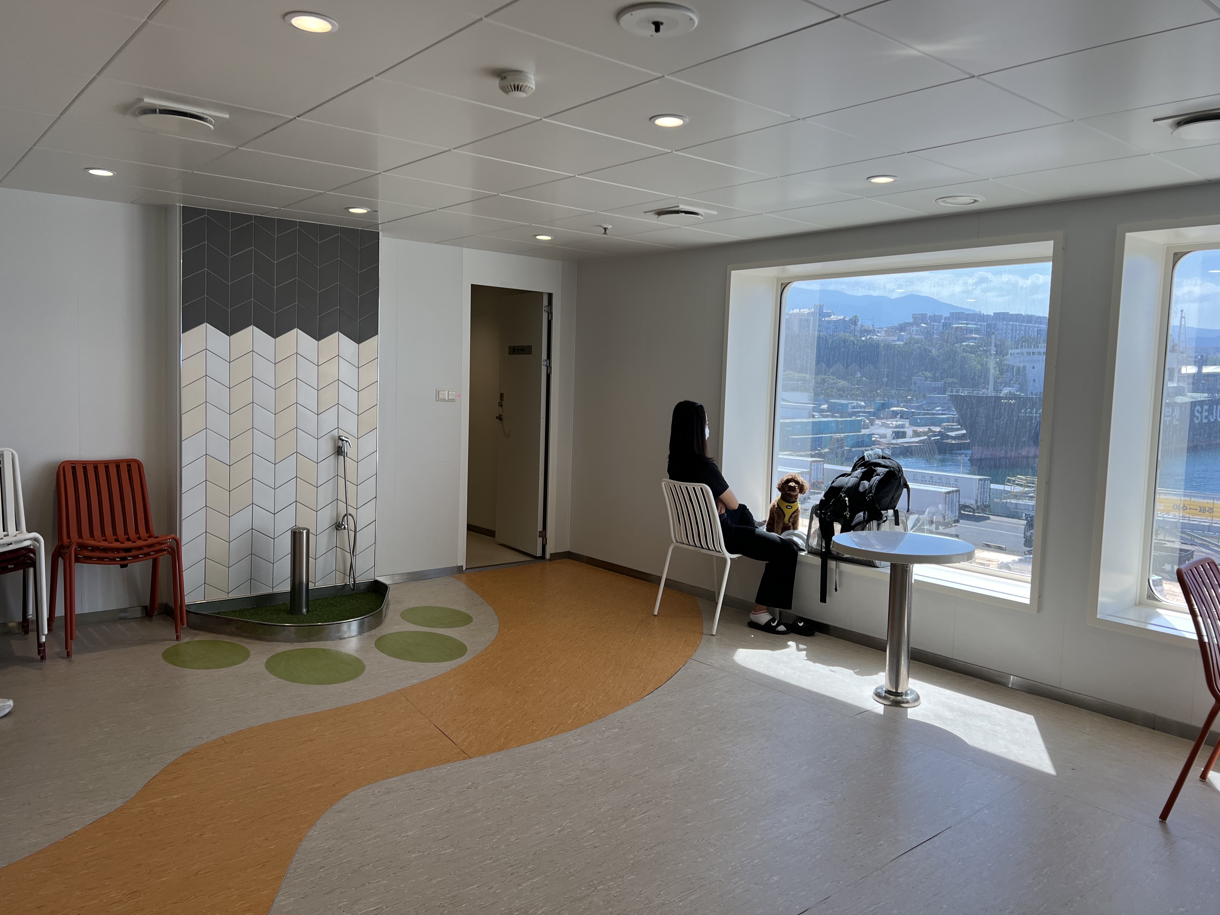 퀸제누비아호엔 강아지와 이용할 수 있는 공간은 펫플레이룸, 펫스탠다드룸 그리고 펫스위트룸이 있었다. 먼저 퀸제누비아호의 펫플레이룸은 강아지와 동반해 이코노미 티켓을 끊었거나 펫스탠다드룸과 펫스위트룸을 이용하는 모든 승객이 오가며 이용할 수 있는 실내 공용 공간이었다. 이곳은 반려인 1명 당 1마리의 반려견이 동반 가능하며, 10kg 이하인 친구들만 이용할 수 있다. 여러 개의 테이블과 의자, 실내 배변공간, 그리고 강아지를 잠시 분리해 넣어둘 수 있는 라커룸들이 있었다. 배 안의 식당이나 오락 공간은 반려견과 동반 이용이 불가하기 때문에 라커룸이 마련된 것 같았으나 유리문의 구멍이 커서 소형견이라면 빠져나와 2층칸의 경우 떨어질 수 있을 것 같았다. 펫플레이룸 안에선 강아지들이 자유롭게 돌아다니기 때문에 솜이처럼 강아지를 좋아하지 않는다면 추천하지 않는 객실이다.