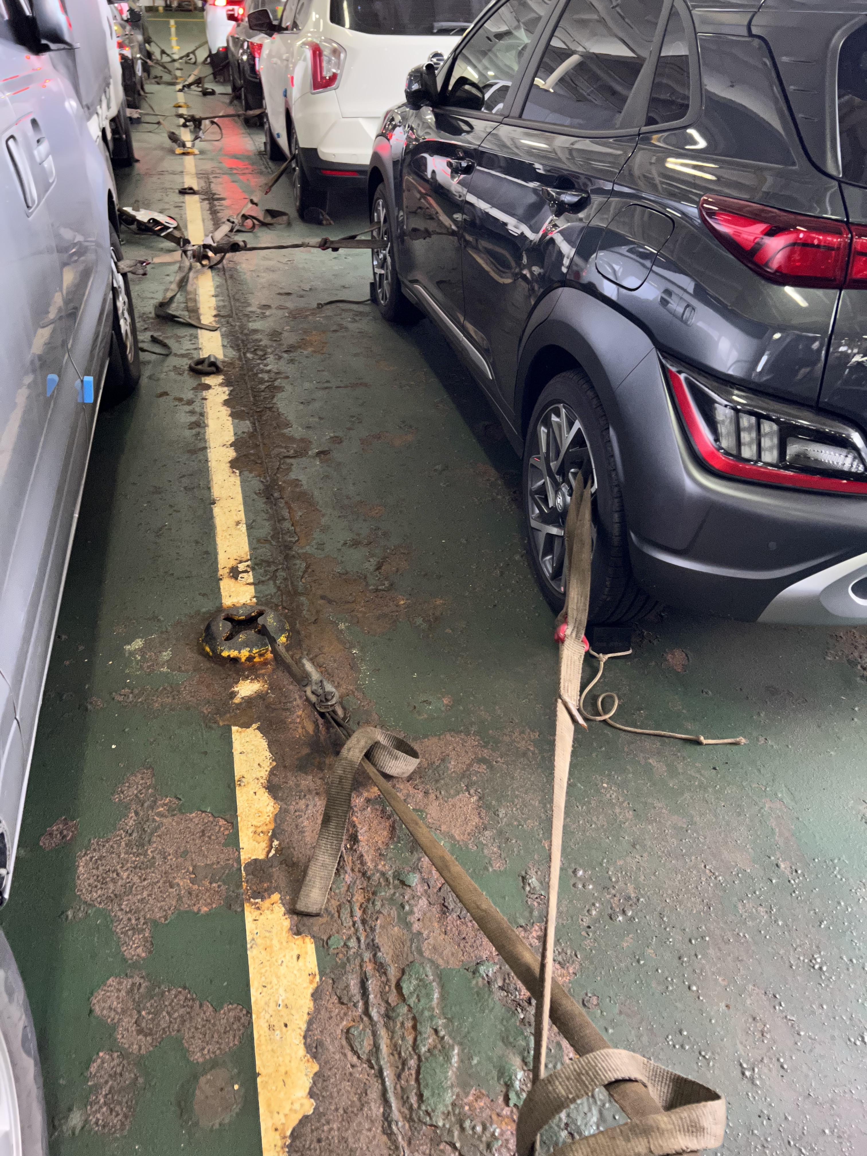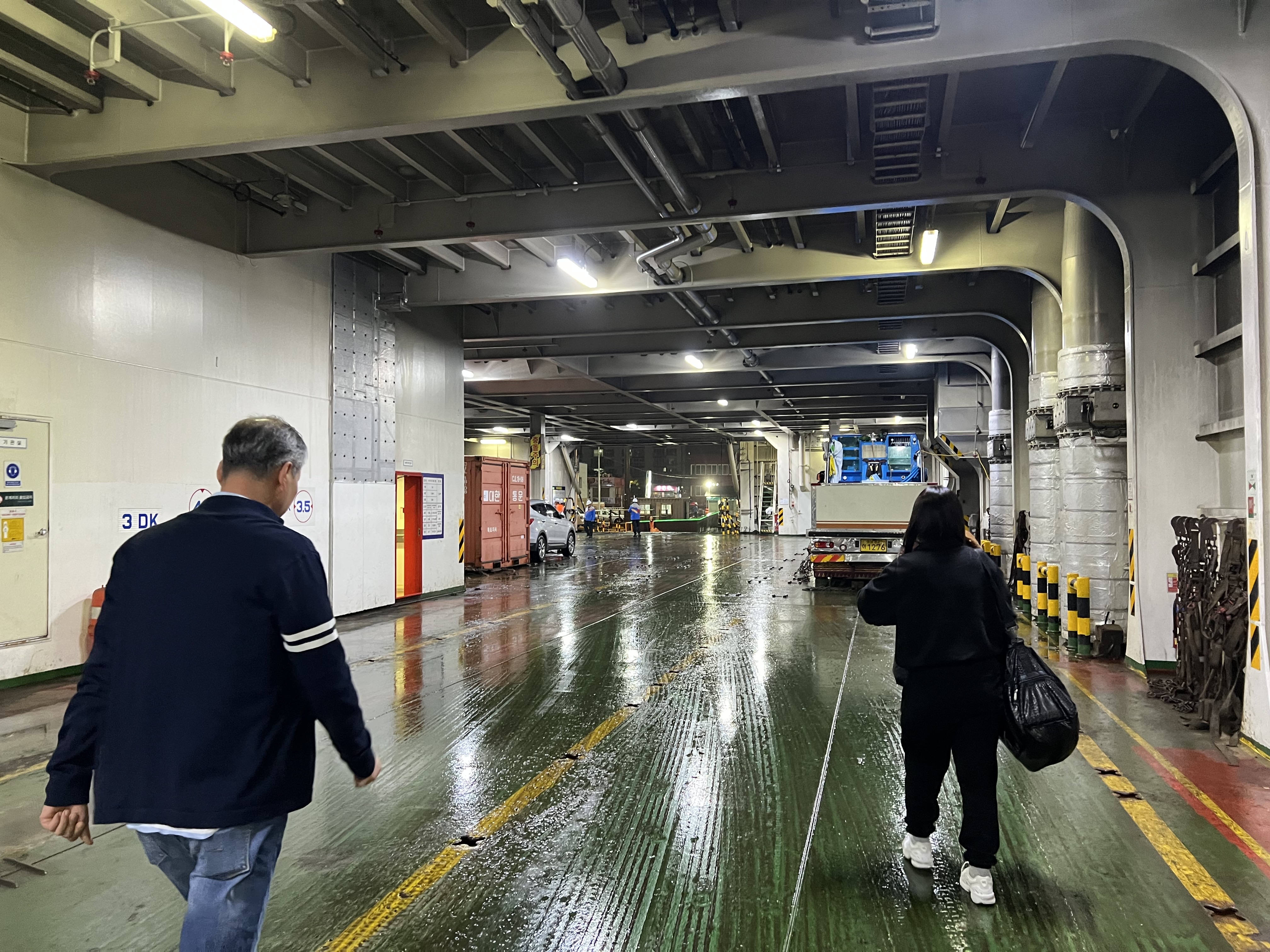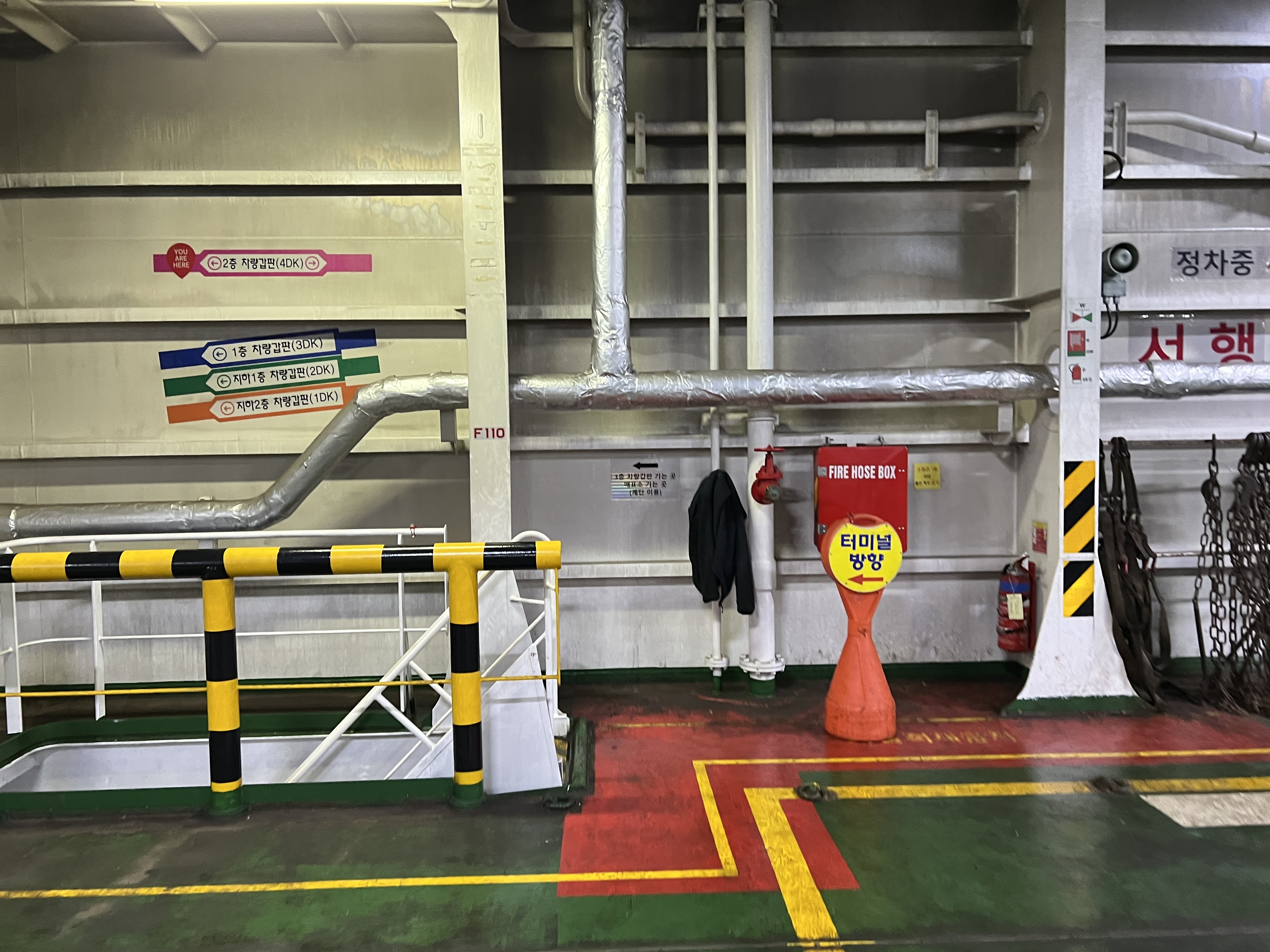 차를 선적하는 부두로 가면 운전면허증과 예약된 차량 번호 확인 후 직원의 안내에 따라 배 안에 선적하면 된다. 일찍 도착할수록 가장 안쪽에 선적해 배에서 내릴 때 오래 걸린다는 말이 있었는데, 막상 타보니 지그재그로 주차되어 위치에 따라 나가는 순서가 달라졌다. 배 안에 주차 시 사이드 브레이크를 걸고 내리면 직원분들이 체인을 바퀴에 걸어 고정시켜 준다. 차를 선적 후 나오면 제주에 도착할 때까지 차로 이동할 수 없다. 따라서 필요한 짐은 미리 챙겨 차량 선적 후 가지고 나와야 한다.