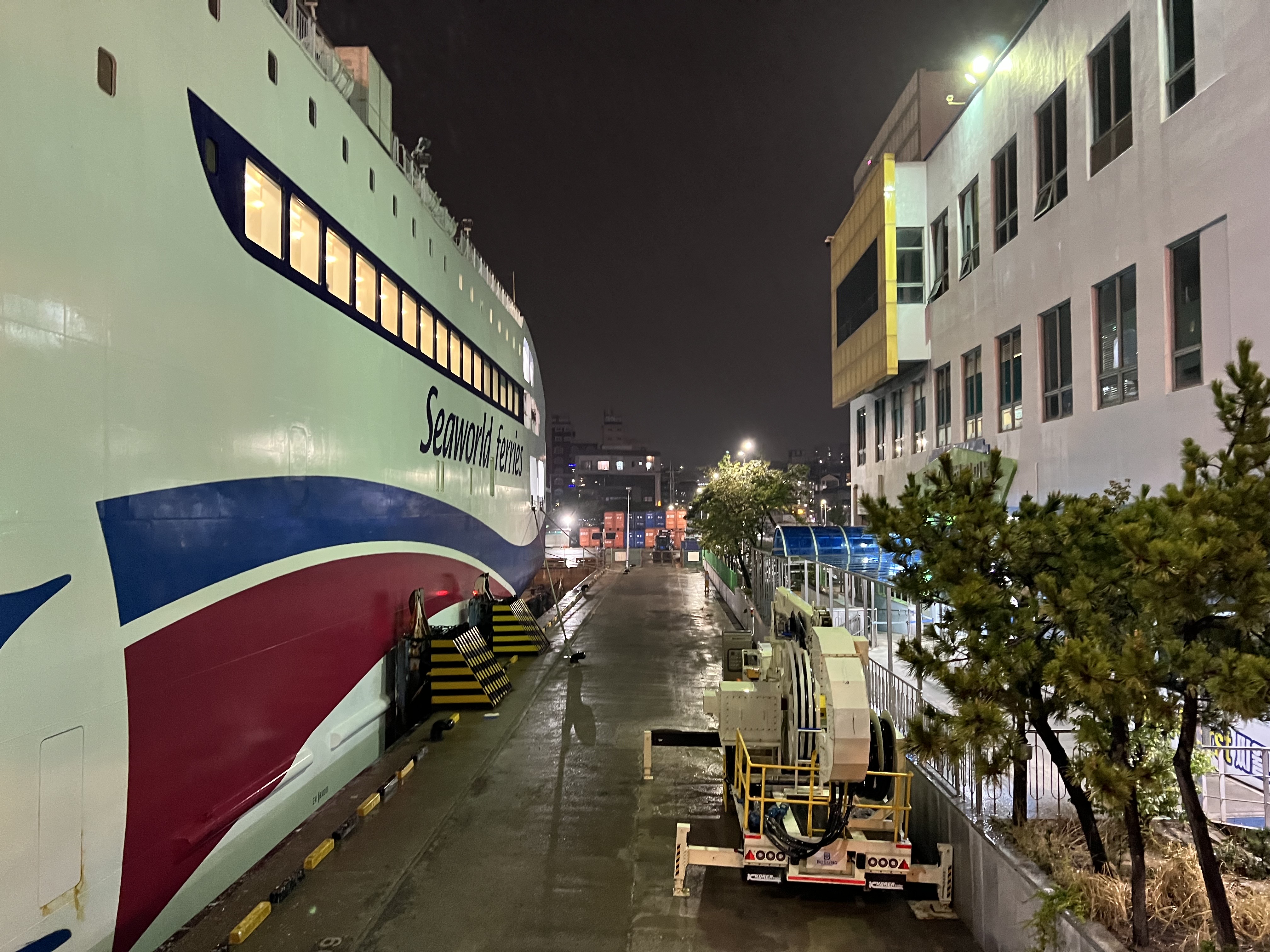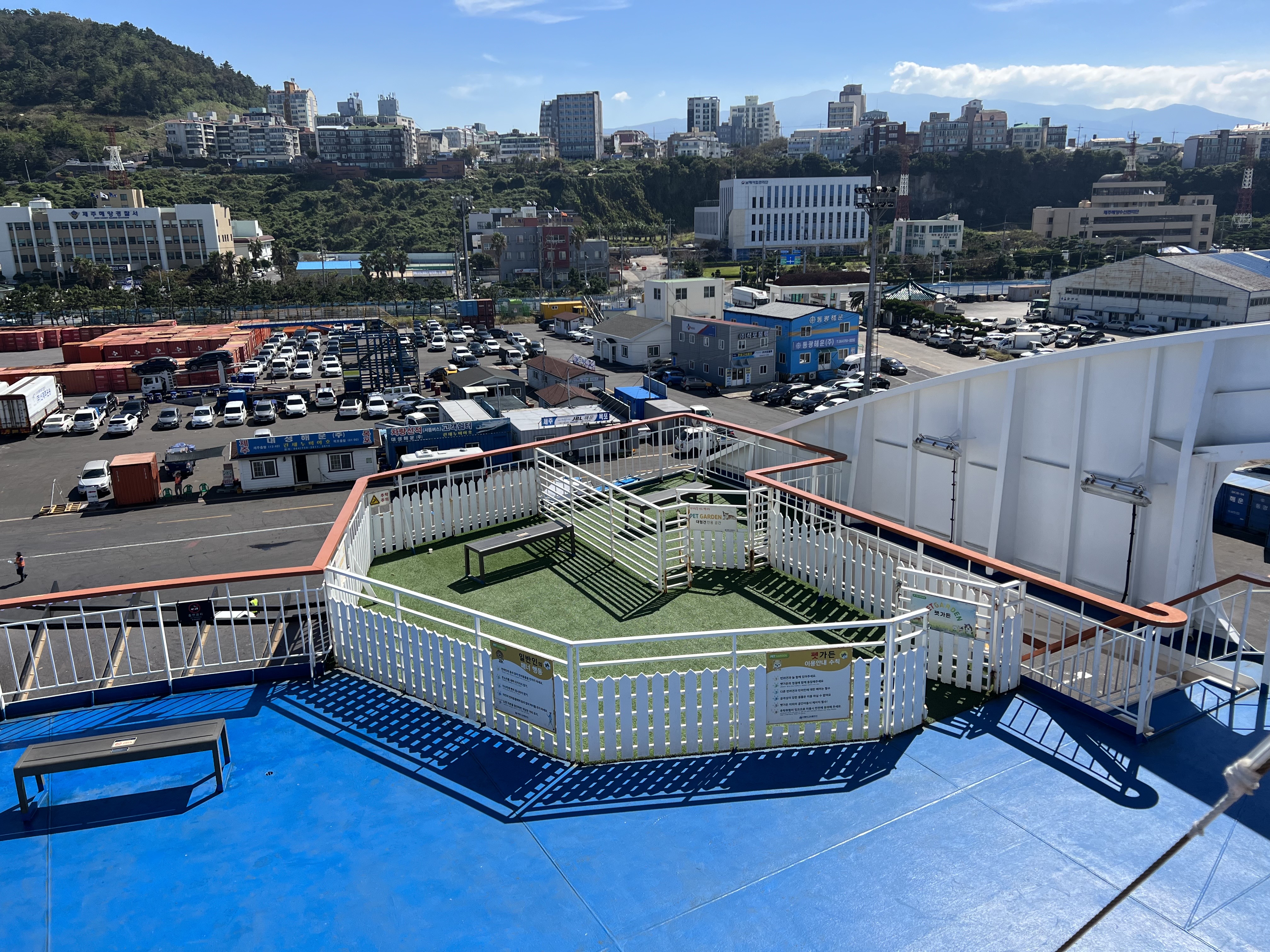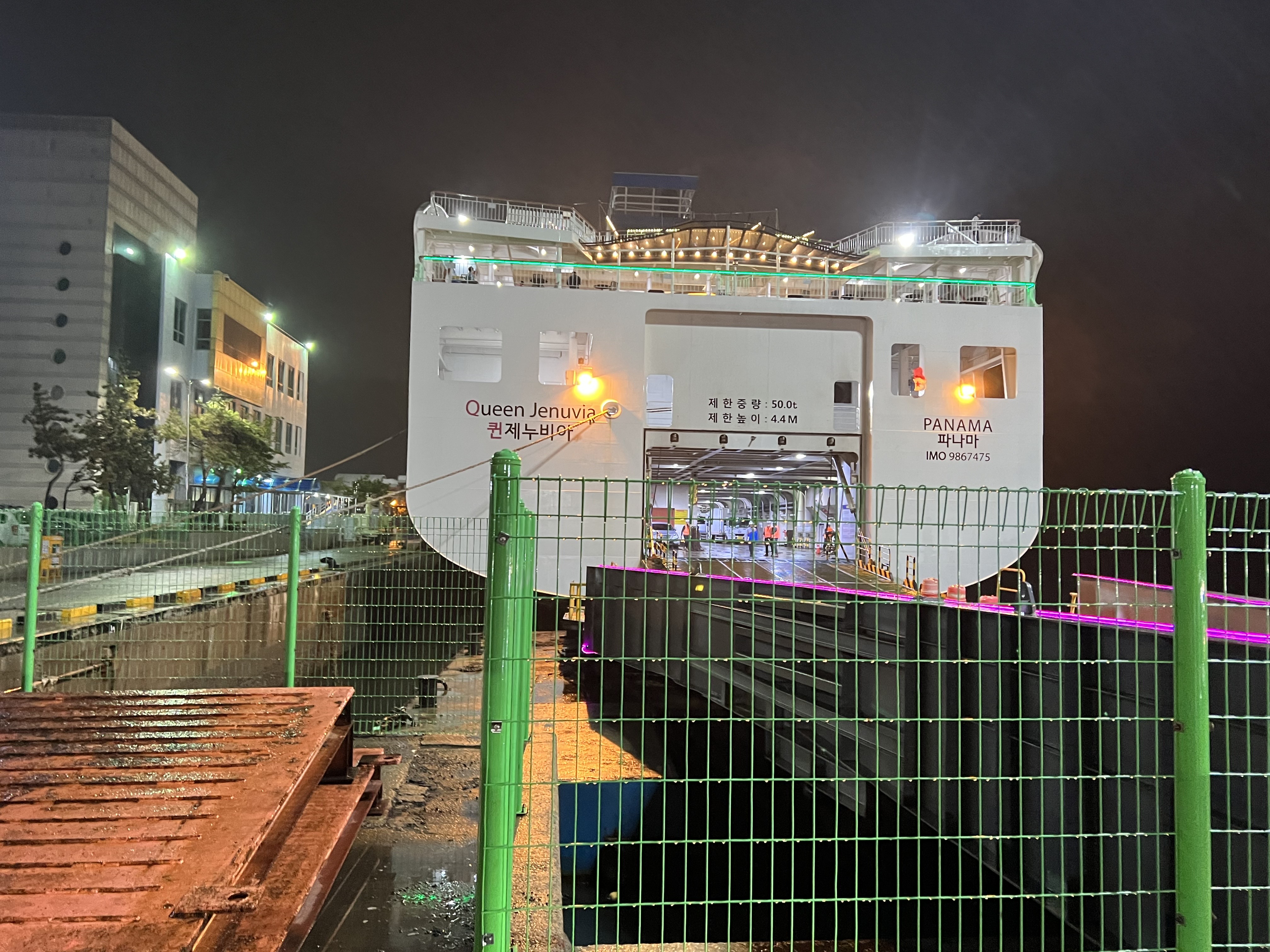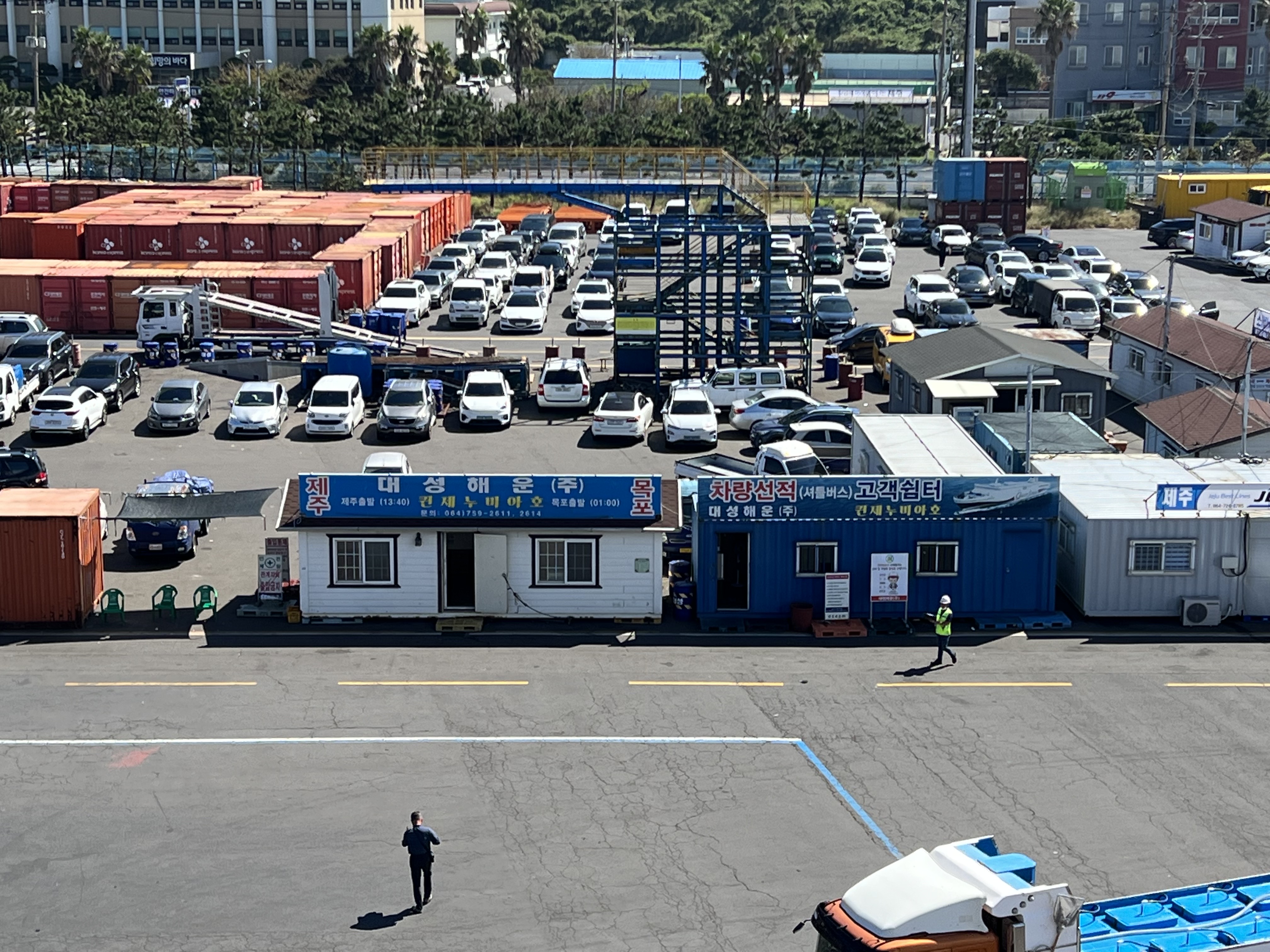 차를 선적하는 부두로 가면 운전면허증과 예약된 차량 번호 확인 후 직원의 안내에 따라 배 안에 선적하면 된다. 일찍 도착할수록 가장 안쪽에 선적해 배에서 내릴 때 오래 걸린다는 말이 있었는데, 막상 타보니 지그재그로 주차되어 위치에 따라 나가는 순서가 달라졌다. 배 안에 주차 시 사이드 브레이크를 걸고 내리면 직원분들이 체인을 바퀴에 걸어 고정시켜 준다. 차를 선적 후 나오면 제주에 도착할 때까지 차로 이동할 수 없다. 따라서 필요한 짐은 미리 챙겨 차량 선적 후 가지고 나와야 한다.