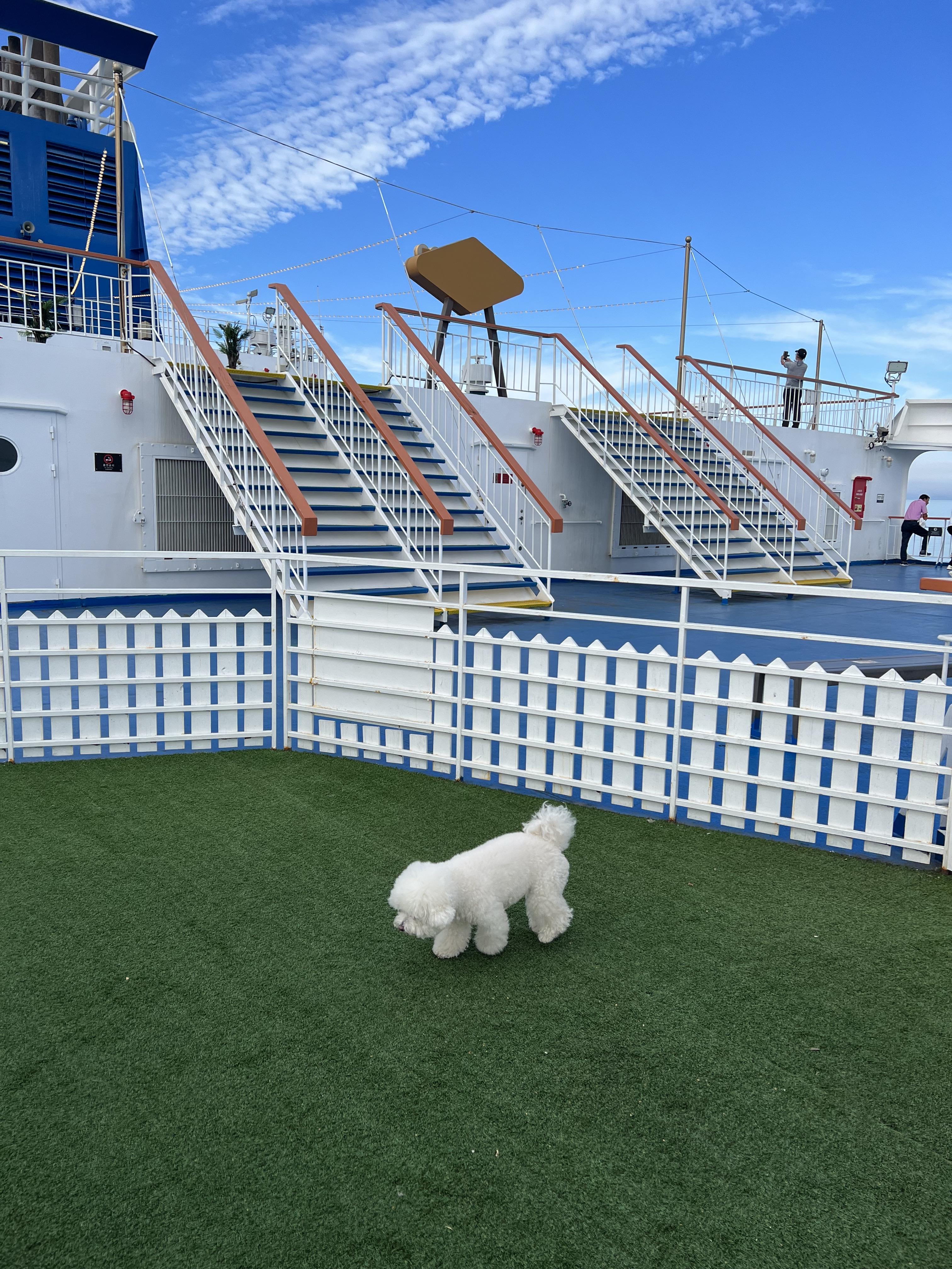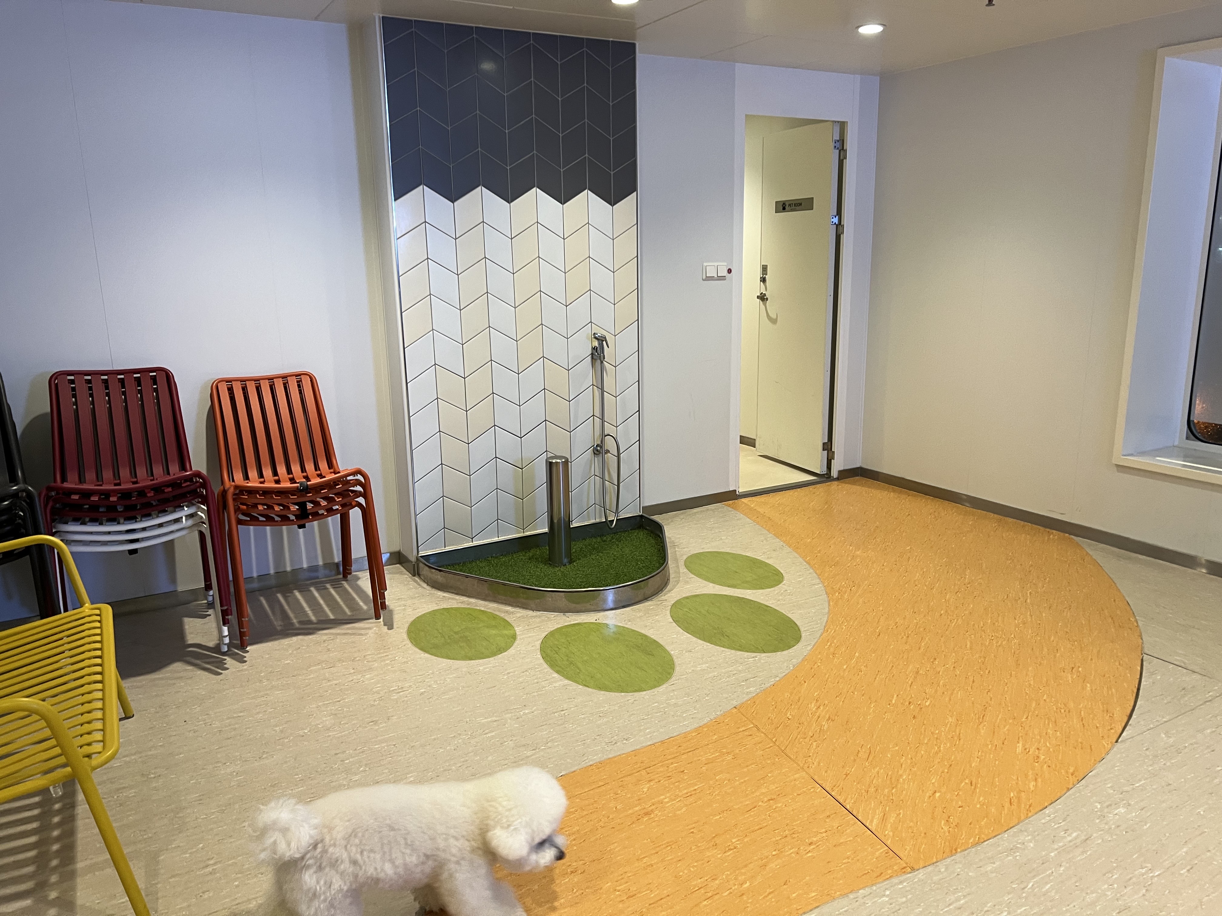 퀸제누비아호엔 다양한 편의시설이 구비되어 있는데, 그중 강아지를 위한 공간은 6층 야외 갑판에 위치한 야외 운동장이 있다. 크기는 작지만 대형견과 중소형견을 위한 공간이 분리되어 있으며, 인조잔디가 깔려 있기 때문에 실외배변을 하는 친구들도 걱정 없다. 다만 비가 오거나 배가 많이 흔들릴 경우엔 갑판 이용이 불가하므로 야외 운동장도 입장이 불가하다. 날씨가 좋지 않은 날엔 실내 플레이룸을 이용하거나 배변패드를 챙겨 가면 좋을 듯하다.