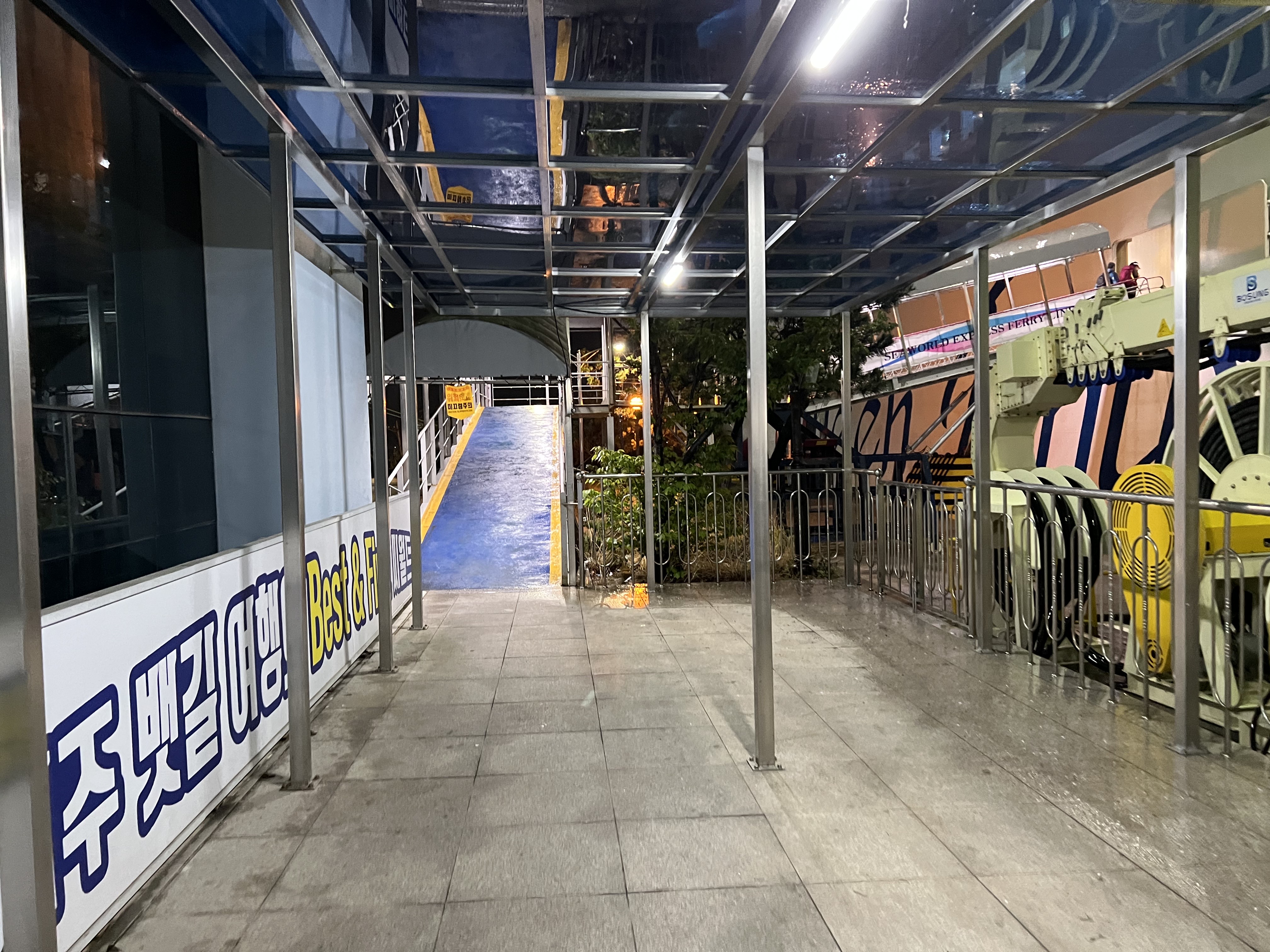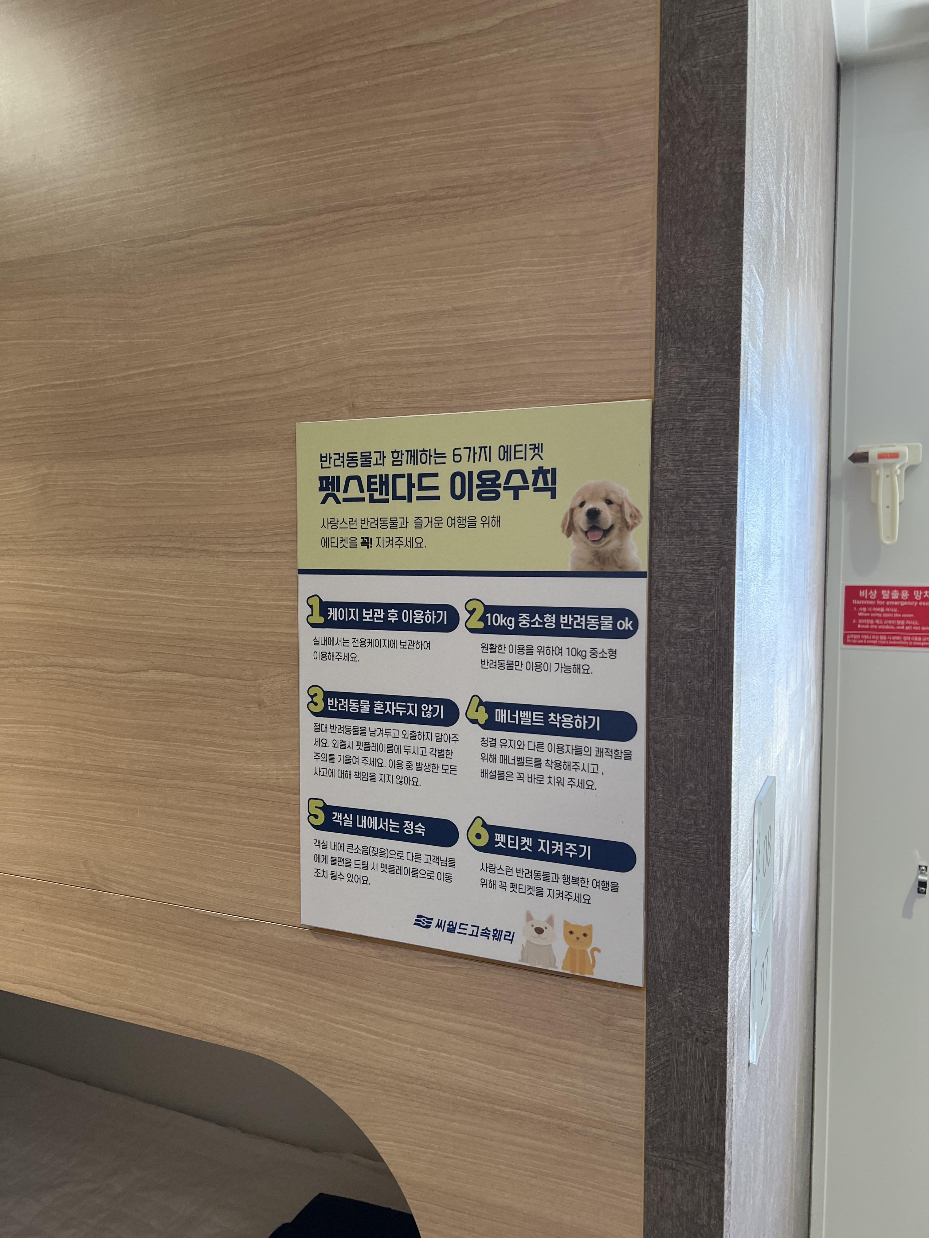 퀸제누비아호 탑승 및 실내 이동시 강아지는 이동가방이나 유모차를 이용해야 한다. 나는 유모차보다는 이동가방이나 캔넬을 추천하는데 그 이유는 첫 번째 배를 승선할 때 계단과 에스컬레이터를 이용해야 하기 때문이다. 특히 제주에서 출발하는 경우 버스를 타고 배까지 이동해야 하므로 유모차를 접었다 펴거나 들고 이동하는데 불편함을 겪을 수 있다. 두 번째 이유는 펫플레이룸과 펫스탠드룸은 여러 강아지와 사람이 함께 이용하기 때문에 펫스위트룸에 비해 공간이 협소하다. 유모차를 세워둘 공간이 마땅치 않기 때문에 이동가방을 사용하는 것을 추천한다.