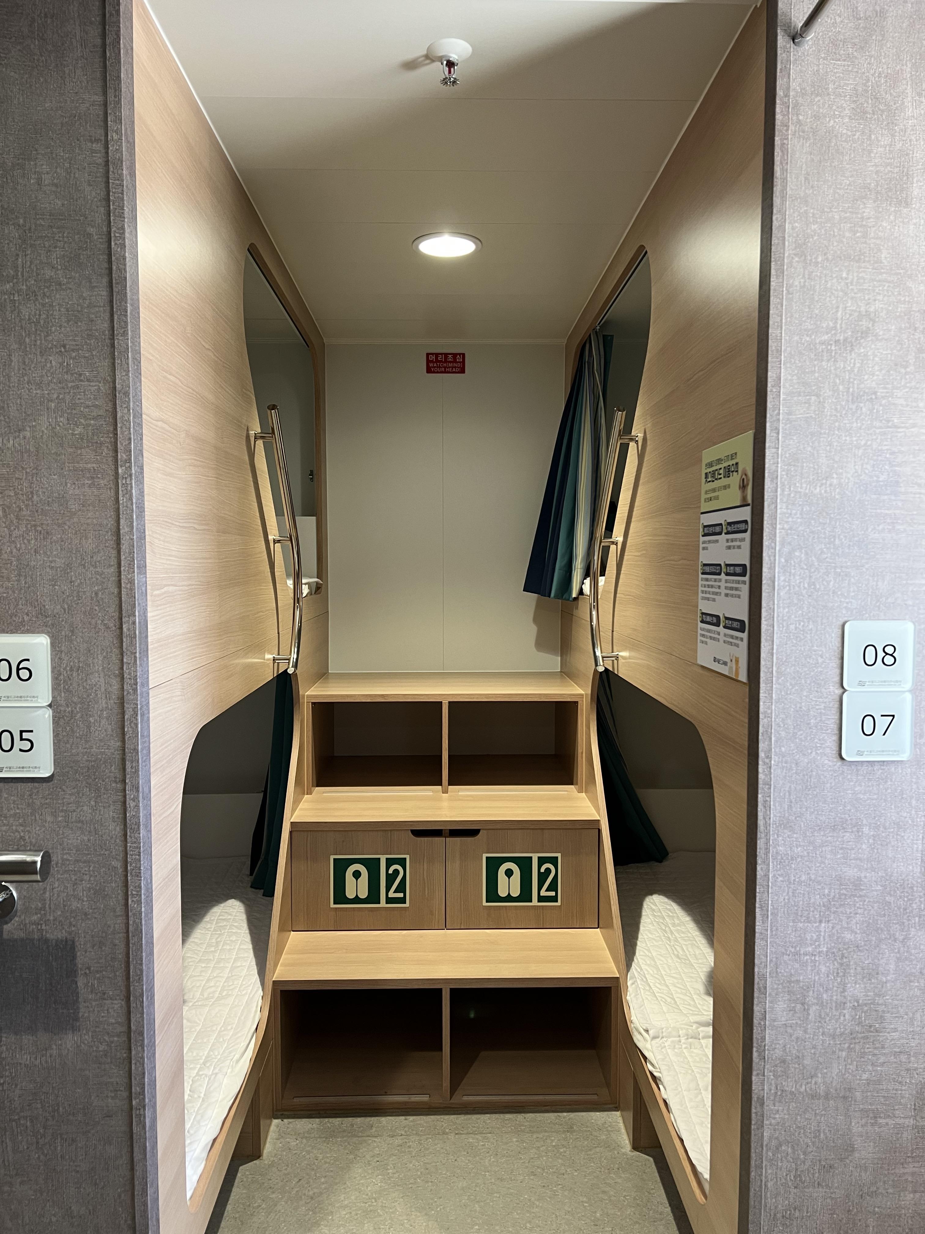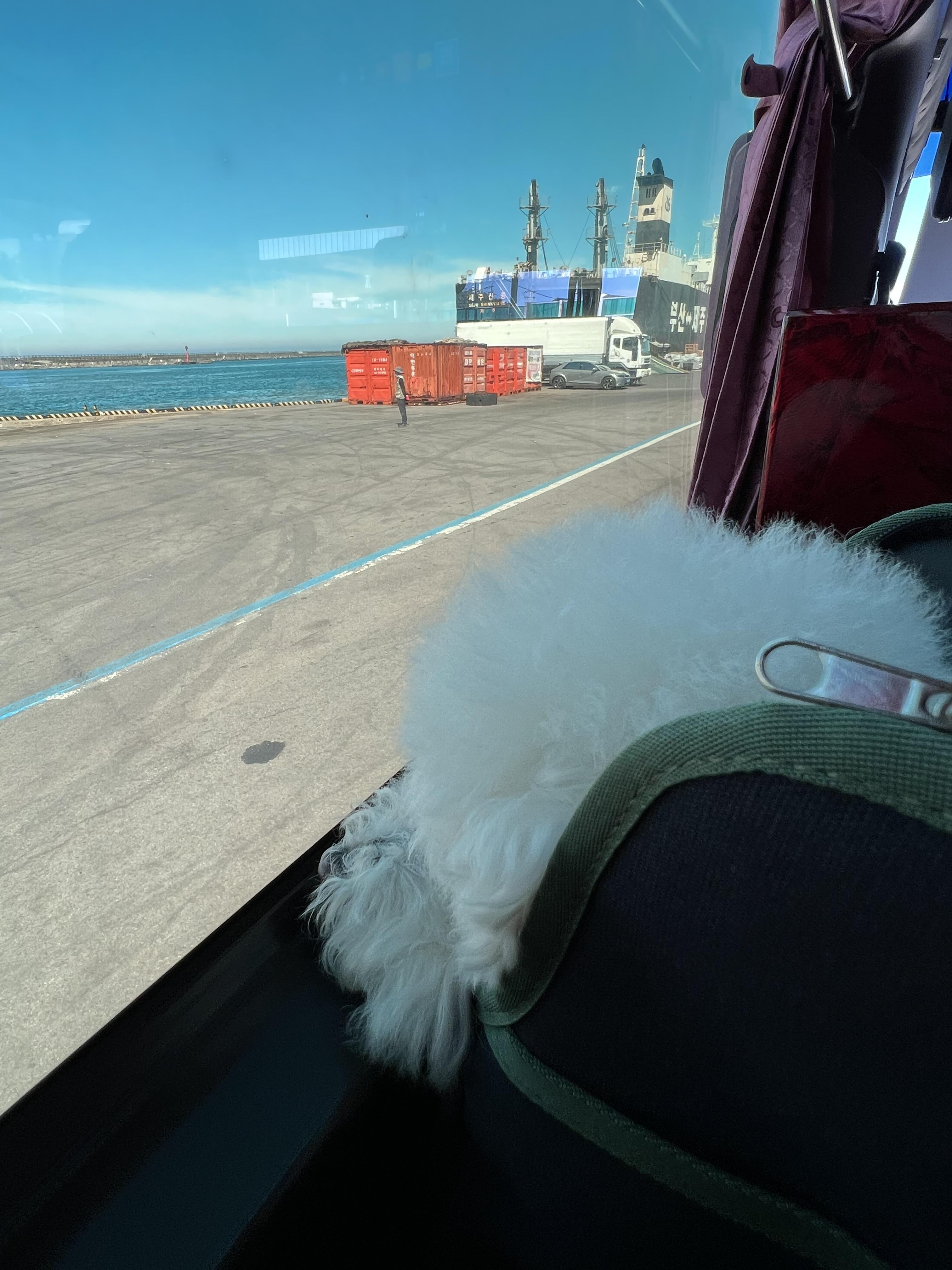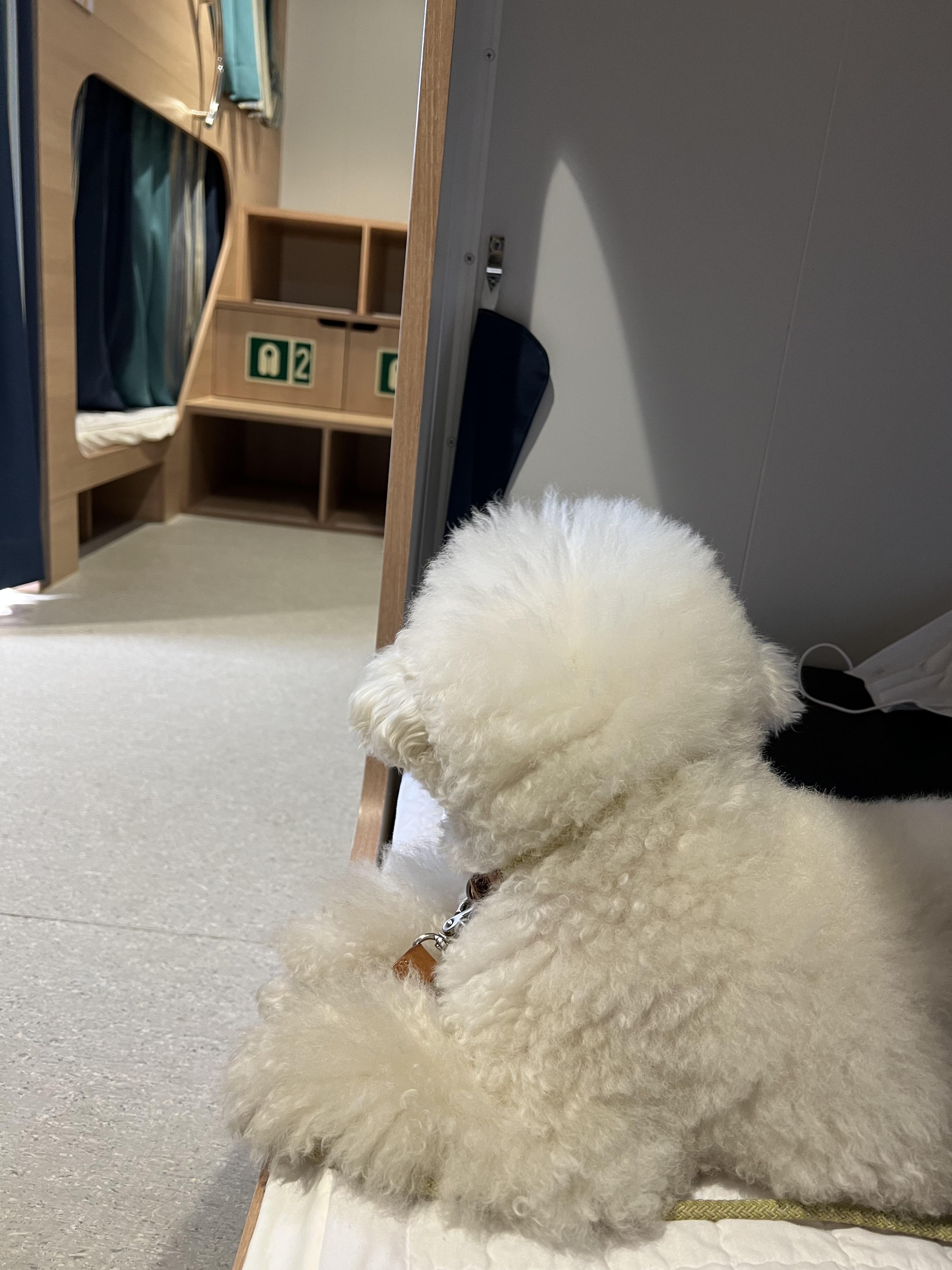 목포에서 새벽에 출발하는 경우 대부분 퀸제누비아호 안에서 잠을 청한다. 그런데 자다가 깜짝 놀라 깨는 경우들이 있었는데, 바로 강아지나 아이들이 돌아다닐 때였다. 아무래도 모두가 쉬는 공간인 만큼 내 반려견이 캐빈 밖으로 나가거나 돌아다니지 않도록 주의해야 한다. 혹시라도 다른 강아지와 마주쳤을 때 사고가 일어날 수도 있기 때문이다. 그래서 나는 도착할 때까지 솜이에게 목줄을 착용한 뒤 리드줄을 손목에 걸어두거나 캐빈 안에 있는 고리에 걸어 두었다. 배 안에서 모두가 얼굴 붉힐 일이 생기지 않도록 강아지와 아이들 모두 반려인과 부모의 노력이 필요할 것 같다.