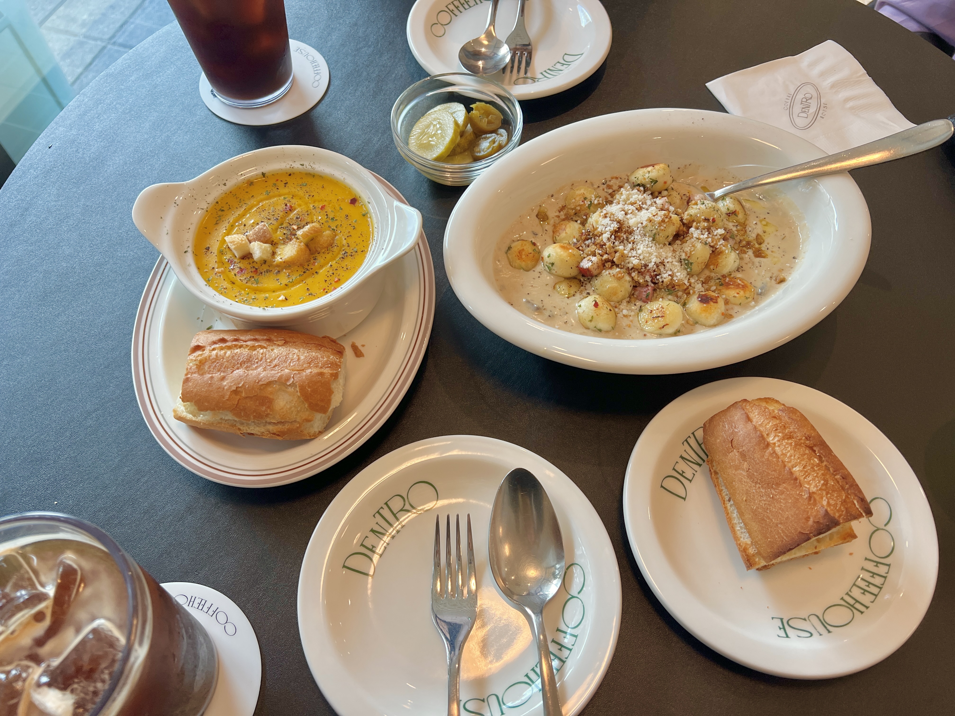 덴트로 커피 하우스에는 식사를 위한 올데이 브런치 메뉴와 디저트가 모두 준비되어 있다. 브런치 메뉴로는 수프, 프렌치토스트, 파스타, 뇨끼, 샐러드가 있다. 새로운 메뉴가 나올 때마다 다 먹어본 사람으로서 덴트로 커피 하우스에 처음 방문한다면 '프렌치토스트'와 '베이컨 쉬림프 보드카 로제 파스타'를 먹어 보는 것을 추천한다. 고메 타히티 바닐라빈 앙글레이즈 소스 위에 사워도우 바게트, 바삭한 크럼블과 제철 과일이 올라가는 시그니처 메뉴 '프렌치토스트'는 비주얼부터 선택할 수밖에 없다. 예쁘게 생겨서 주문했는데 맛있어서 반칙인 메뉴다. 딱딱할까 싶었던 사워도우 바게트는 생각보다 부드럽고 촉촉했고, 소스는 바닐라빈이 얼마나 많이 들어갔는지 바닐라 향이 가득했다. 거기에 과일까지 더해져 한 끼 식사로 충분하다. '베이컨 쉬림프 보드카 로제 파스타'는 출시 후부터 내가 꾸준히 찾는 메뉴. 진한 감칠맛의 보드카 로제 소스에 버무려진 베이컨과 새우, 파스타면은 맛이 없을 수가 없다. 살짝 매콤한 보스카 소스라 느끼함 없이 다 먹을 수 있었고 심지어는 함께 주신 바게트에 소스까지 몽땅 긁어먹었다. 투박하게 썰린 두툼한 베이컨과 딱 적당하게 익힌 통통한 새우는 씹는 맛을 더한다. 그렇다고 다른 메뉴를 추천하지 않는 것은 절대 아님! 단호박 수프, 시저 샐러드, 바질 페스토 링귀니도 항상 함께 시켜 먹는다. 솔직히 브런치 메뉴를 새로 출시할 때마다 먹어 보는데 아직까지 별로라 느꼈던 것은 없었다.